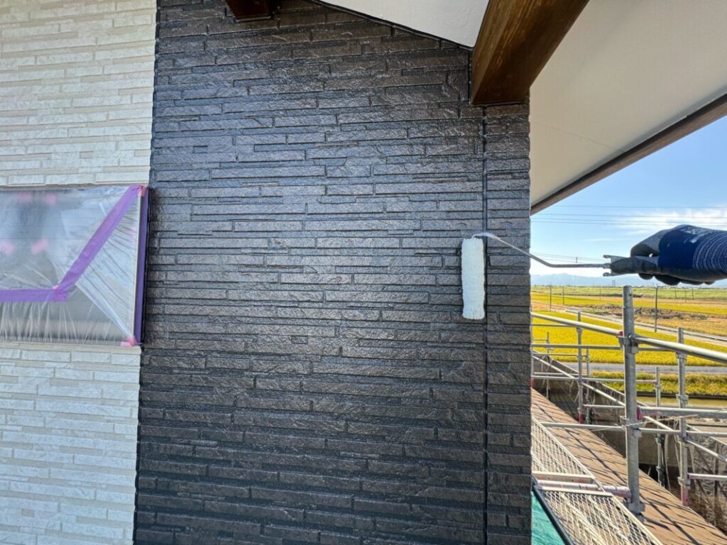 外壁全体に塗料を均一に広げ、塗膜のベースをしっかりと作っていきます😌